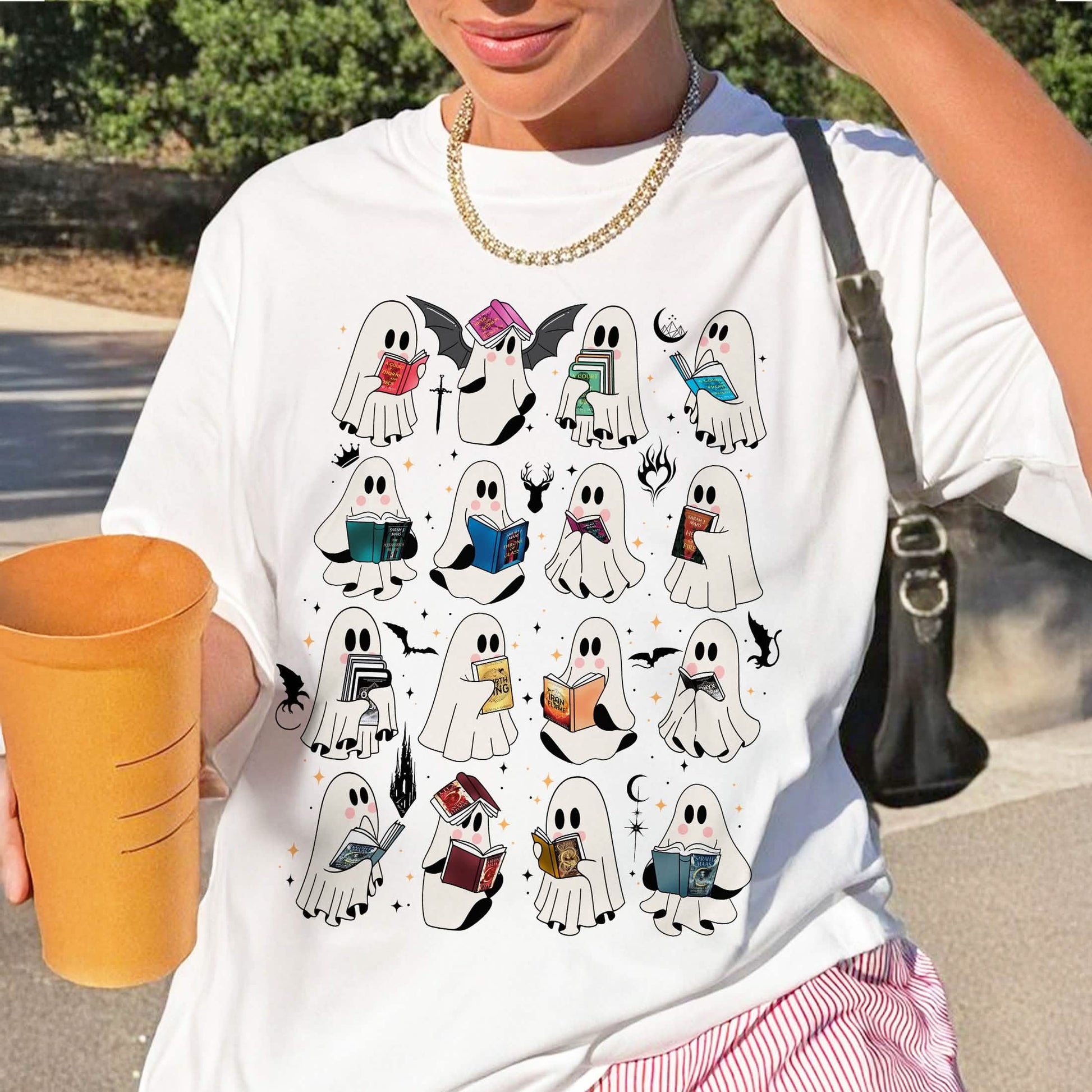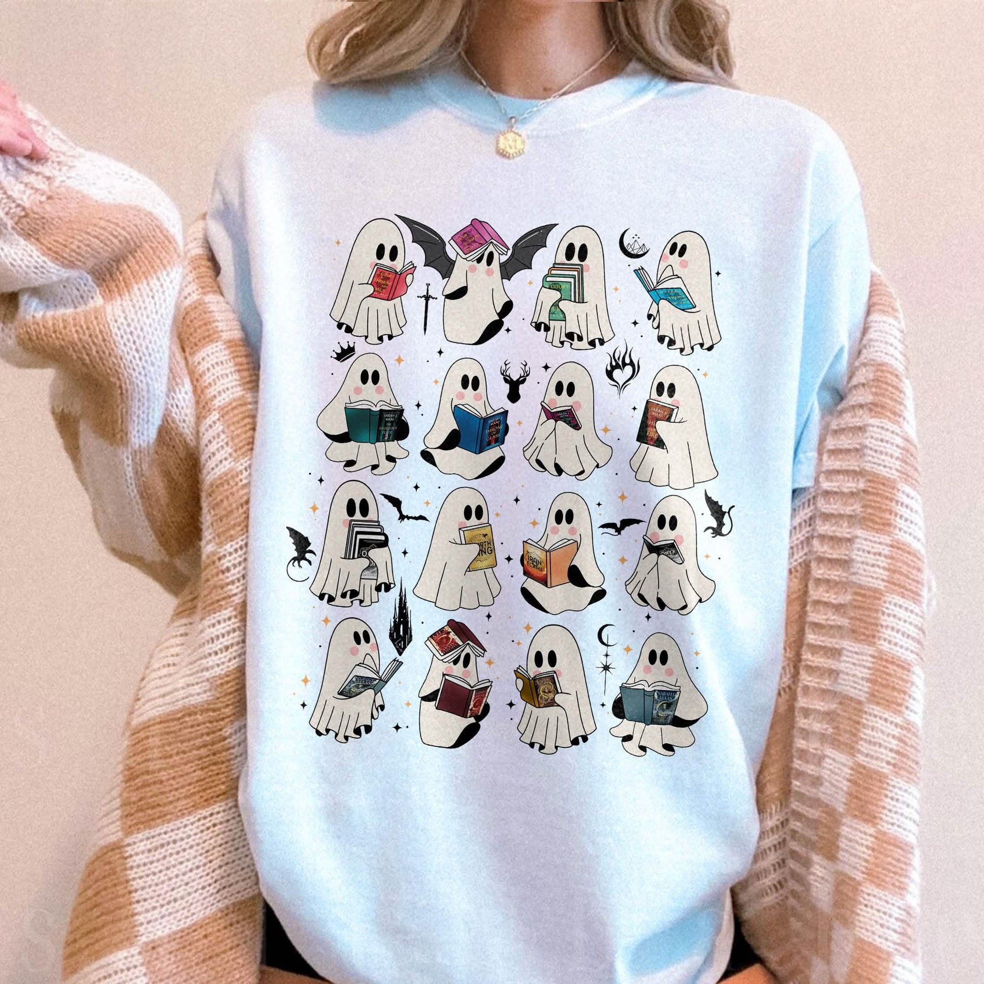 Introducing the perfect addition to your Halloween wardrobe: the Ghost Reading Book t-shirt! Designed for the book lover, this cozy shirt allows you to showcase your love for thrilling stories like the ACOTAR series and the Crescent City series, while also celebrating your passion for the Throne of Glass and Fourth Wing series. Made from Comfort Colors fabric, this bookworm tee ensures you'll stay comfy whether you're attending a Halloween party or curling up with a retro ghost book. Perfect for a librarian Halloween outfit or just for a fun casual day, this ghost t-shirt is a must-have for romantasy book enthusiasts. Embrace your love for reading with style this spooky season!