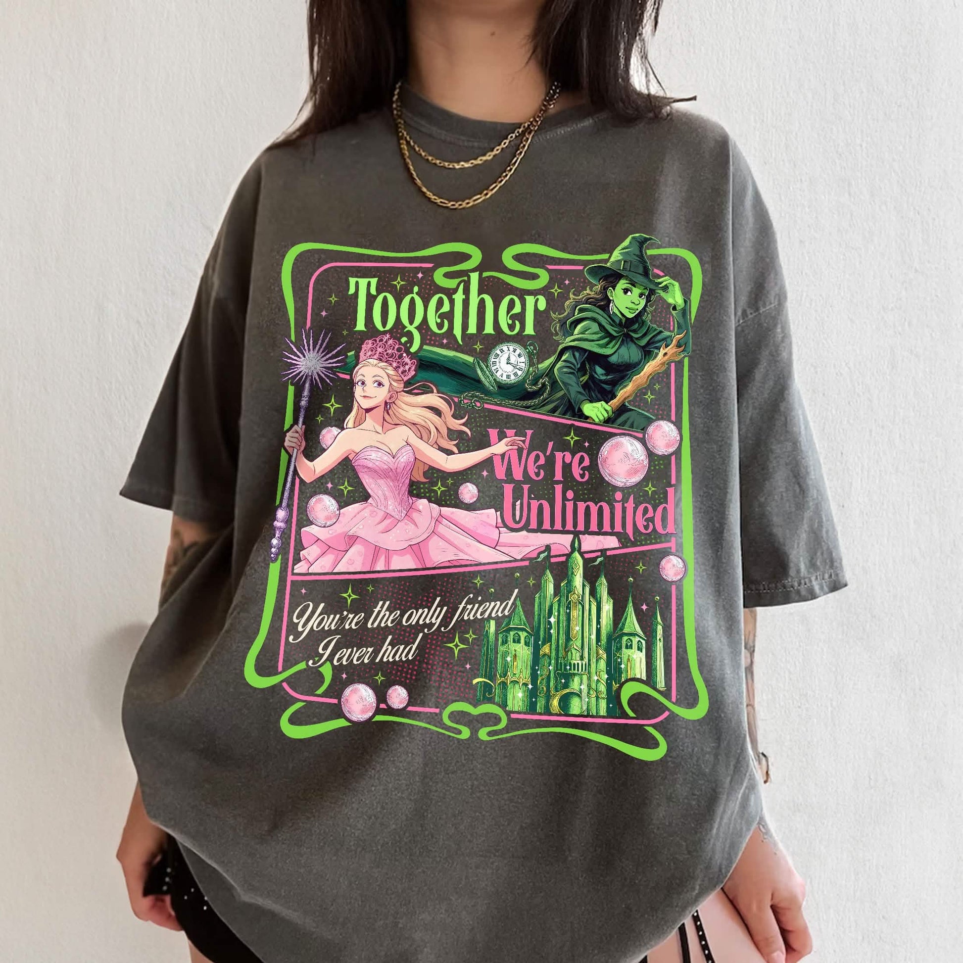 Celebrate friendship, magic, and music with our Wicked “Together We’re Unlimited” Comfort Colors Shirt, the perfect tee for fans of the beloved musical and movie. Featuring a playful, inspiring design, this soft Comfort Colors T-shirt makes a wonderful keepsake for anyone who loves Wicked, Elphaba, Glinda, and the unforgettable songs like Defying Gravity and For Good.